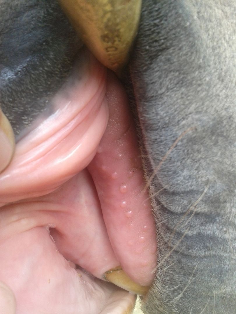 Am having the vet out. Shall call Monday as shut for weekend. Teeth were done in beg February. Noticed she wasn't happy with schooling and was evading collection. Her tounge on both sides are covered in hard blisters. There is nothing nasty in her field. Shall try to attach photo.