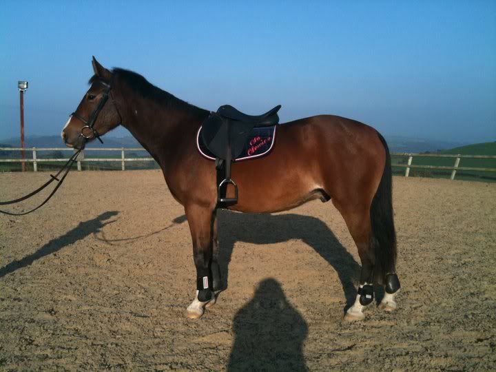 5 year old 15.1hh sports horse gelding by Cor De Brevel (Holsteiner/Selle Francais) out of Goriteifach Glanbaiden (Welsh D/Arab), he is eligable for pasport overstamping as a part bred cob. The shows Im looking to do are local level, not qualifiers so not overly strict on rules.