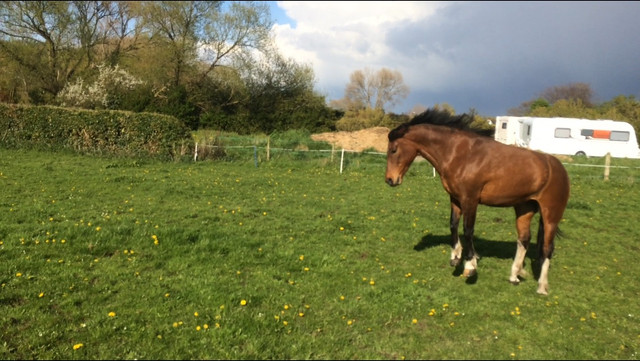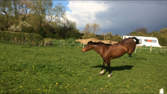 He arrived 'hunting fit' and despite long gallops uphill, 3 hr hacks etc I just can't wear him out. I had the chiropractor out and she has diagnosed a bad back which has been adjusted but he needs 2 weeks off (walking for 20 mins ridden or lunging for 20 mins).