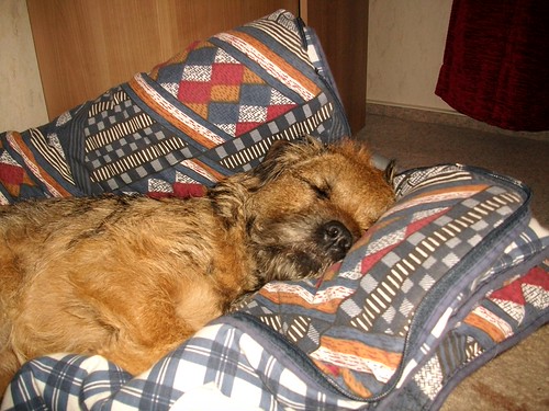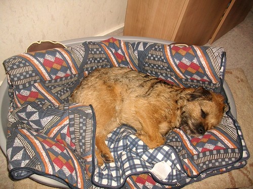 The little dogs are outside in the kennel, Elsie is indoors and sleeps on a vetbed in the corner of our bedroom. During the day she is wherever we are, so currently snoring like a pig laid on the living room floor. If we are in the kitchen she lays on the kitchen floor, ditto dining room etc. She does occasionally take herself upstairs to her own bed in the day, and we have found evidence of her sneaking onto the bed - imprint of her head on the pillow and hairs on the duvet cover!