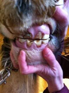 I have rescued a two and a half year old cob he has black teeth at the front surely they cant be rotten on such a young horse im think maybe its been caused by a kick or knock to the mouth if so what will be done will they just fall out or will they need to be taken if they need taking out will this be expensive im having the dentist look at him next week im just curious if anyone else has ever seen a young horse with black teeth. i have put a picture of his teeth here. thanks lucy[IMG